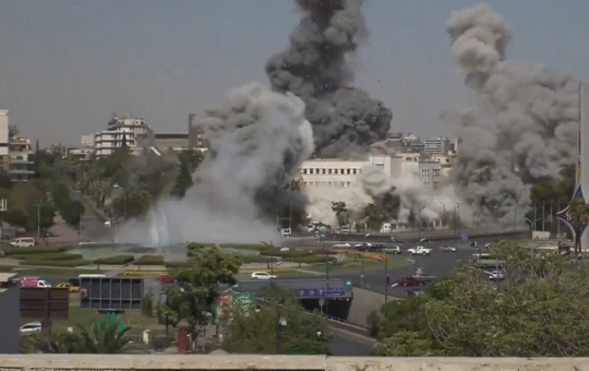 El momento del ataque Israel bombardeó este miércoles en al menos dos ocasiones el Ministerio de Defensa sirio en Damasco,...